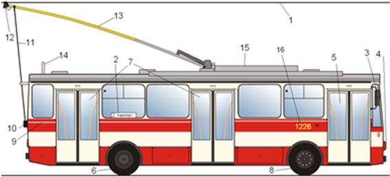 Основные части троллейбуса (могут присутствовать не на всех моделях): 1 – контактная сеть; 2 – указатель маршрута; 3 – зеркала; 4 – фары; 5, 7 – двери; 6, 8 – колёса; 9 – молдинги; 10 – штангоуловитель; 11 – трос штангоуловителя; 12 – башмак токосъёмника; 13 – штанги; 14 – кронштейн фиксации штанги; 15 – наружное электрооборудование; 16 – инвентарный номер троллейбуса.